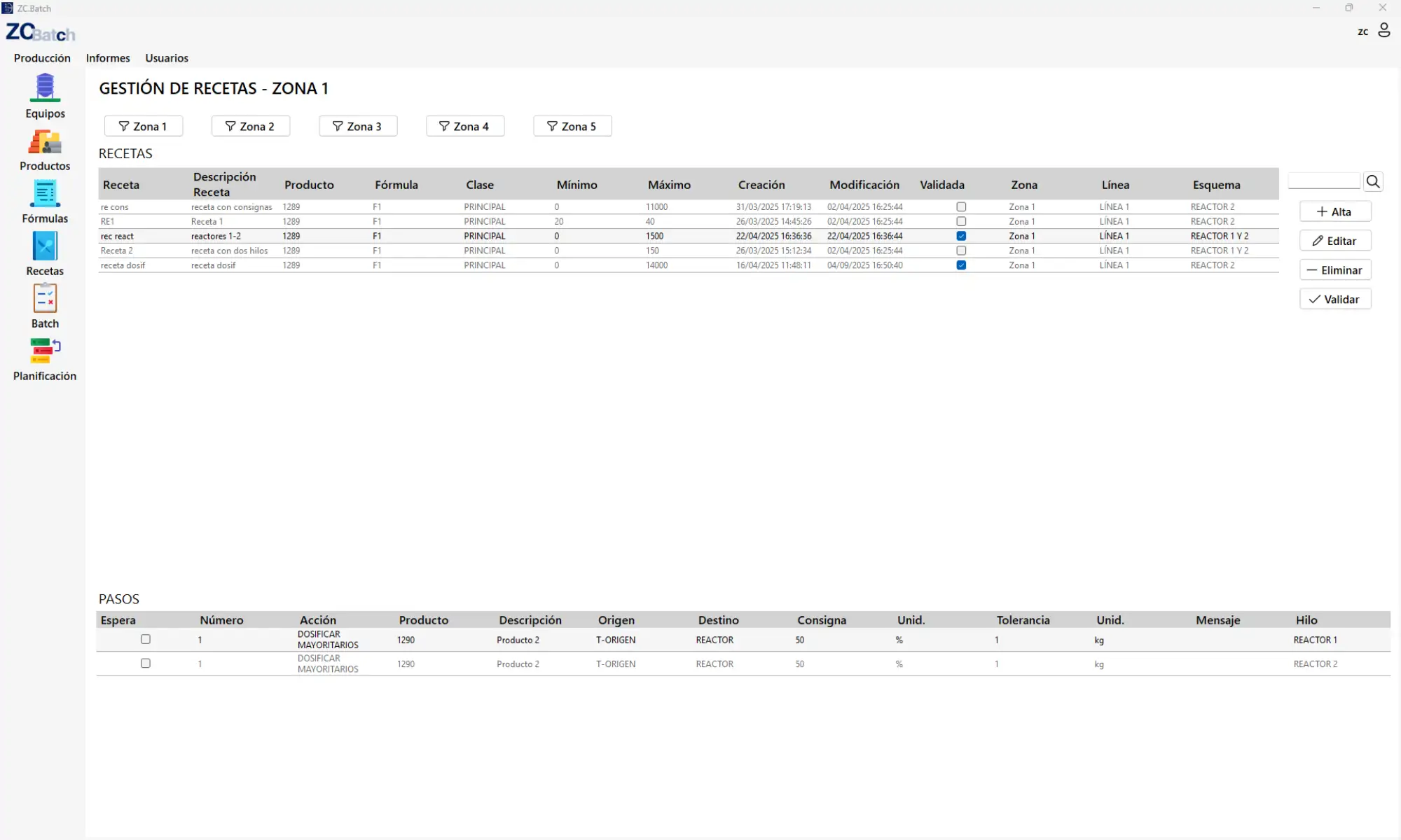 Para la gestión de la fabricación por lotes se integró la aplicación ZC Batch, que permite definir formulaciones, coordinar las distintas etapas del proceso y registrar todos los datos generados durante la producción. La información recopilada proporciona trazabilidad completa y soporte para el análisis posterior de la fabricación.